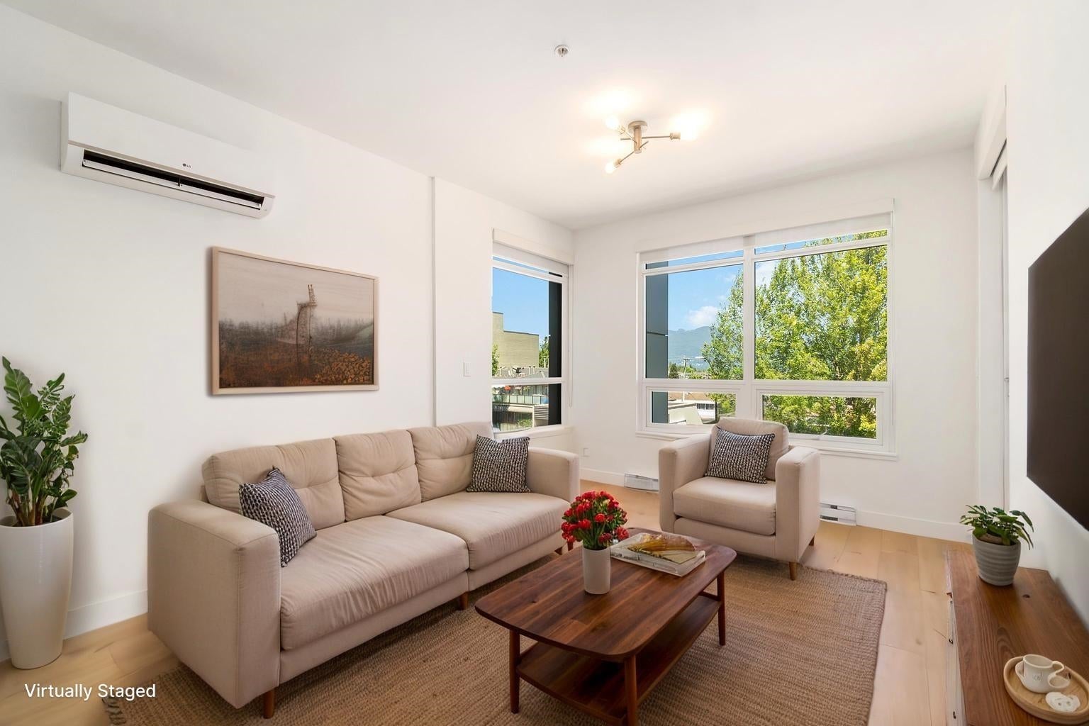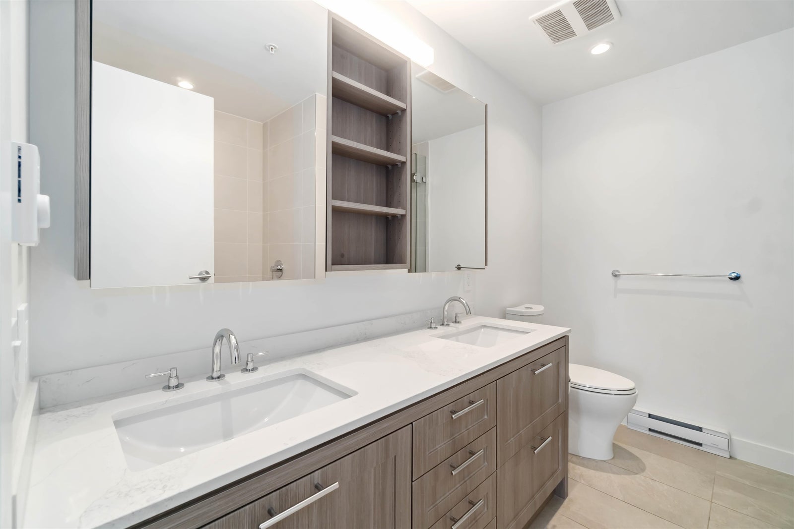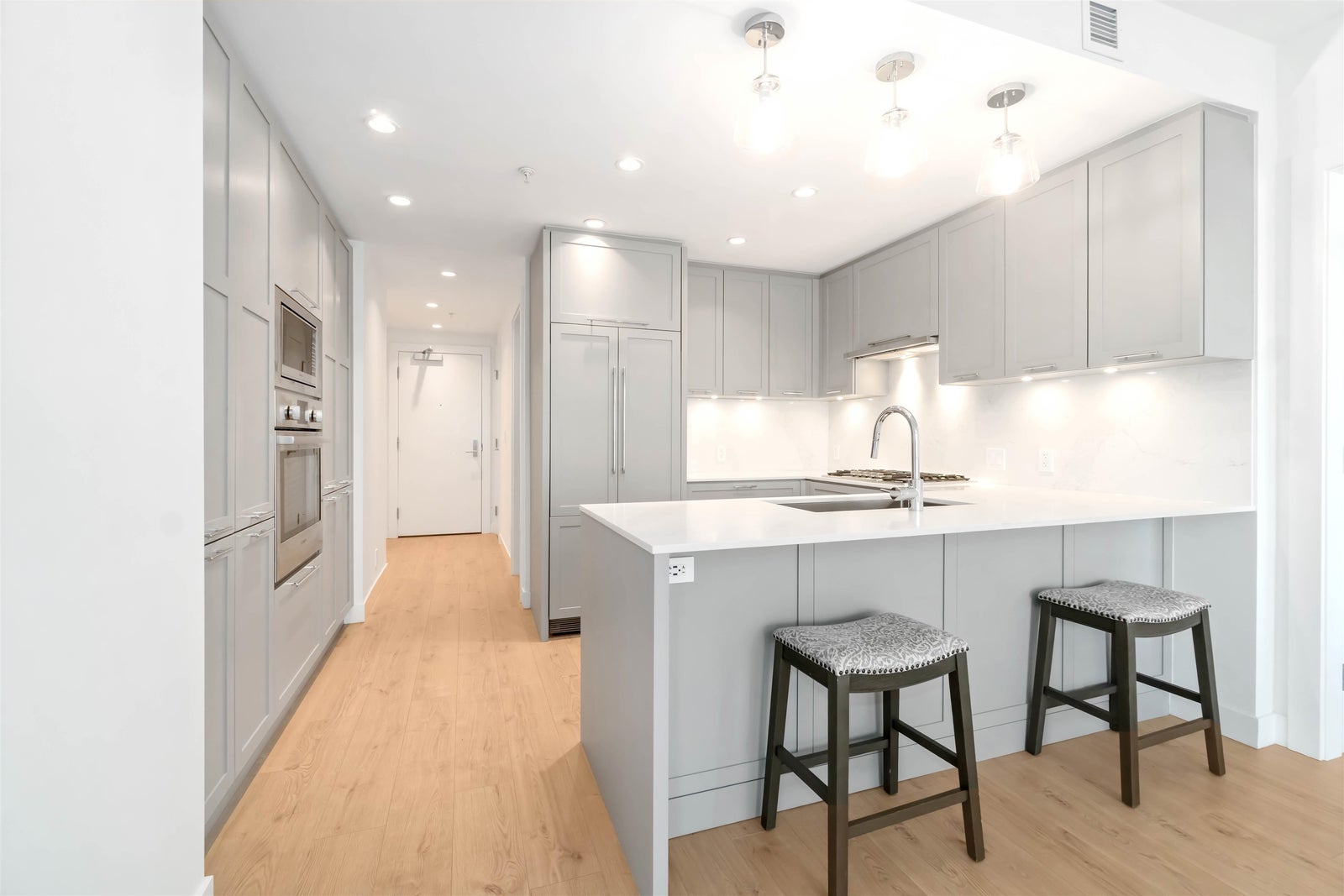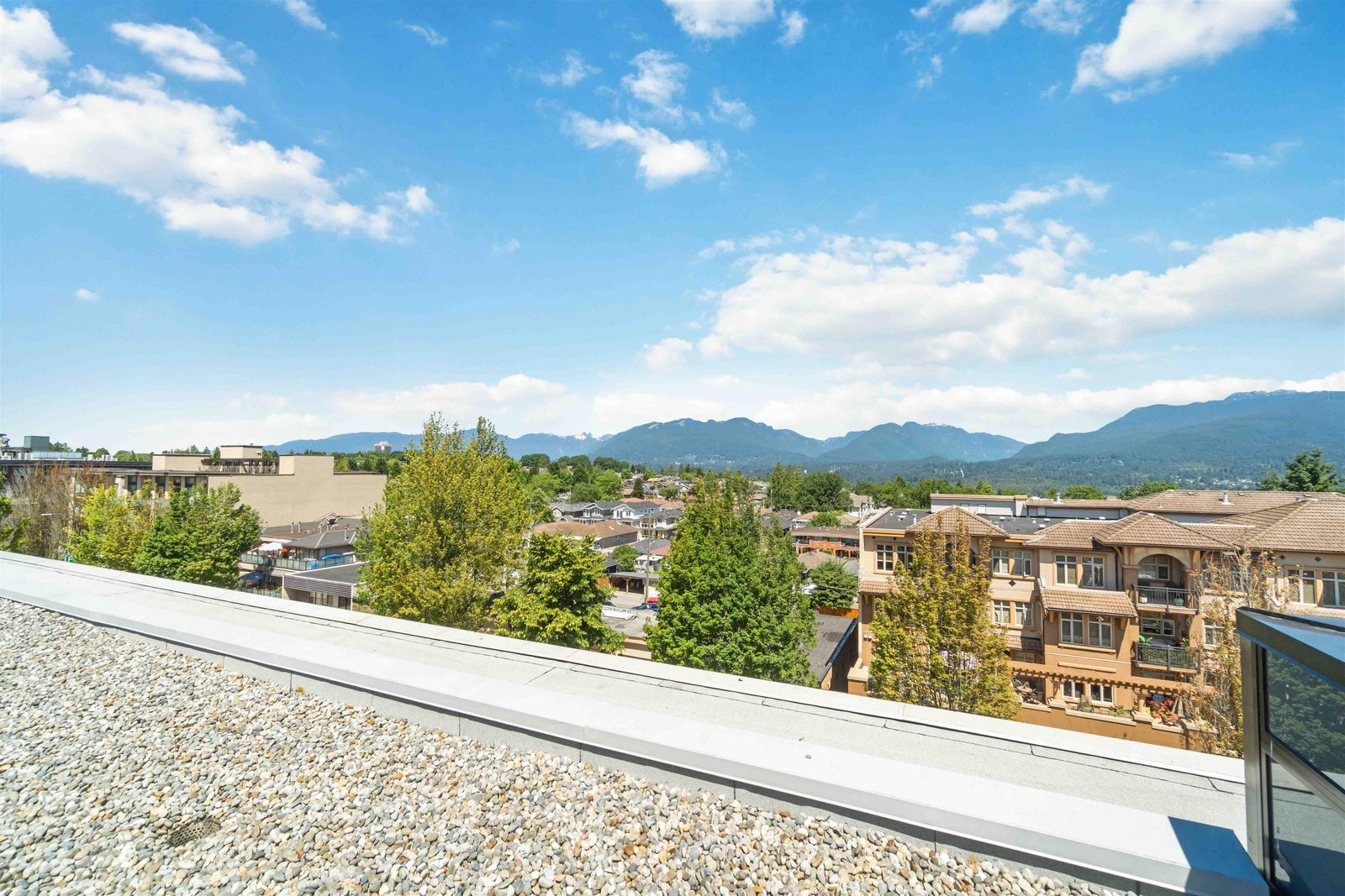 Welcome to Storia by Beedie Living, ideally located in the heart of Burnaby’s vibrant Heights District. This 1198 sq ft 2 bed + den, 3 bath home offers a functional, open concept layout with 9' ceilings, AIR CONDITIONING, roller shades, shaker style cabinets, quartz counters and laminate flooring throughout. The spacious primary bedroom features a walk-through closet and spa-inspired 5-piece ensuite with in-floor heating. Enjoy a chef-inspired kitchen with integrated appliances, wall oven, and pantry. The den is perfect as a home office or guest room. Large second bedroom with ensuite, on opposite side of living space. Private patio with gorgeous VIEWS of the North Shore Mountains! Rooftop terrace w/outdoor seating and panoramic views. Steps to transit, groceries, shopping, and schools.