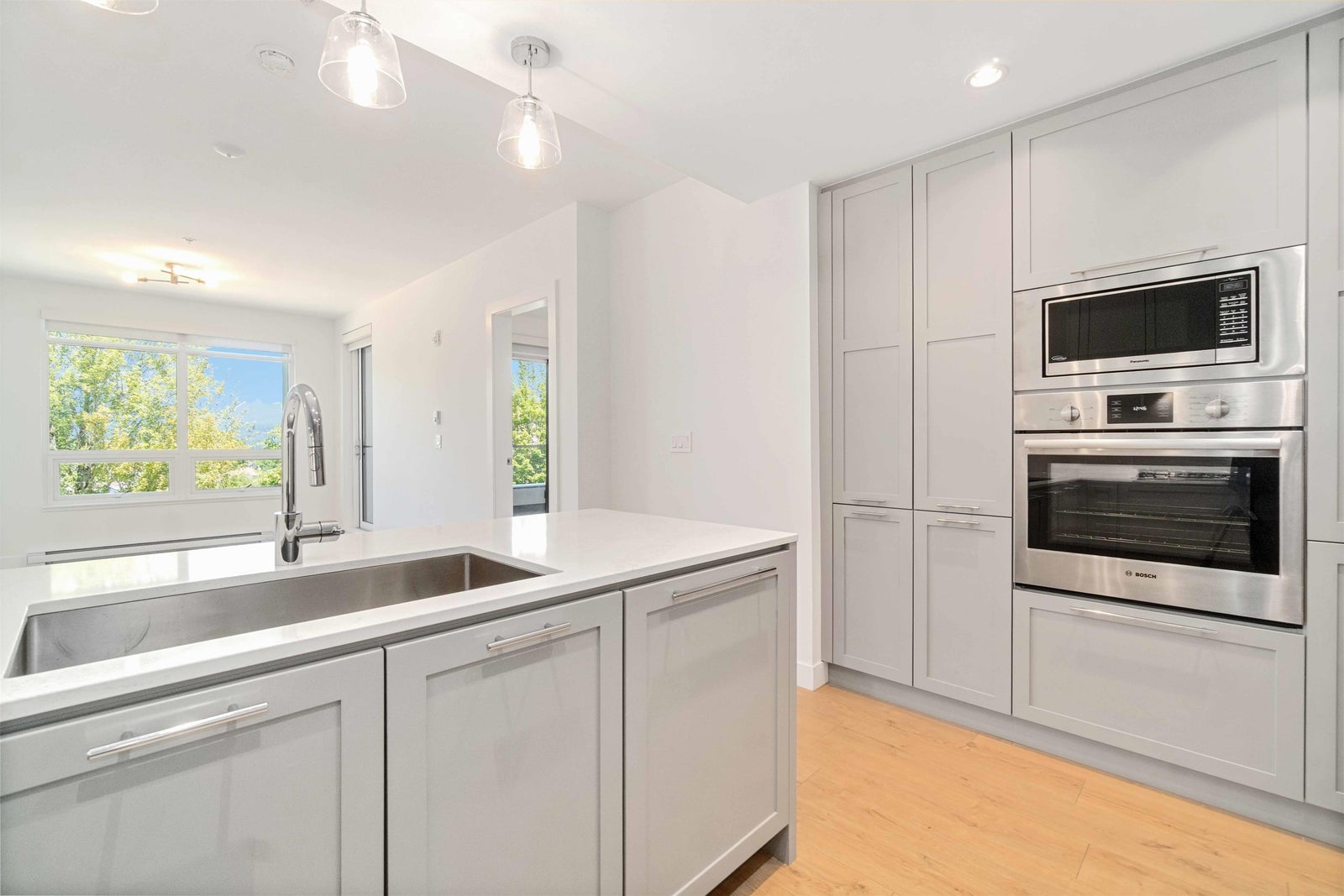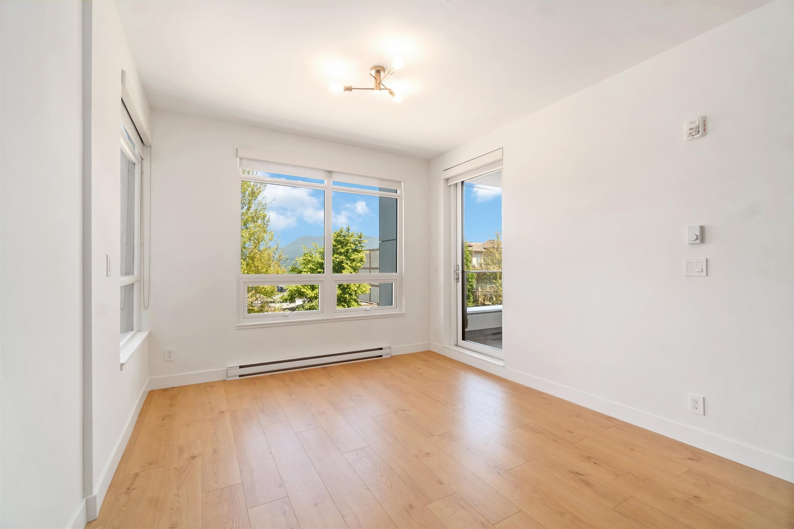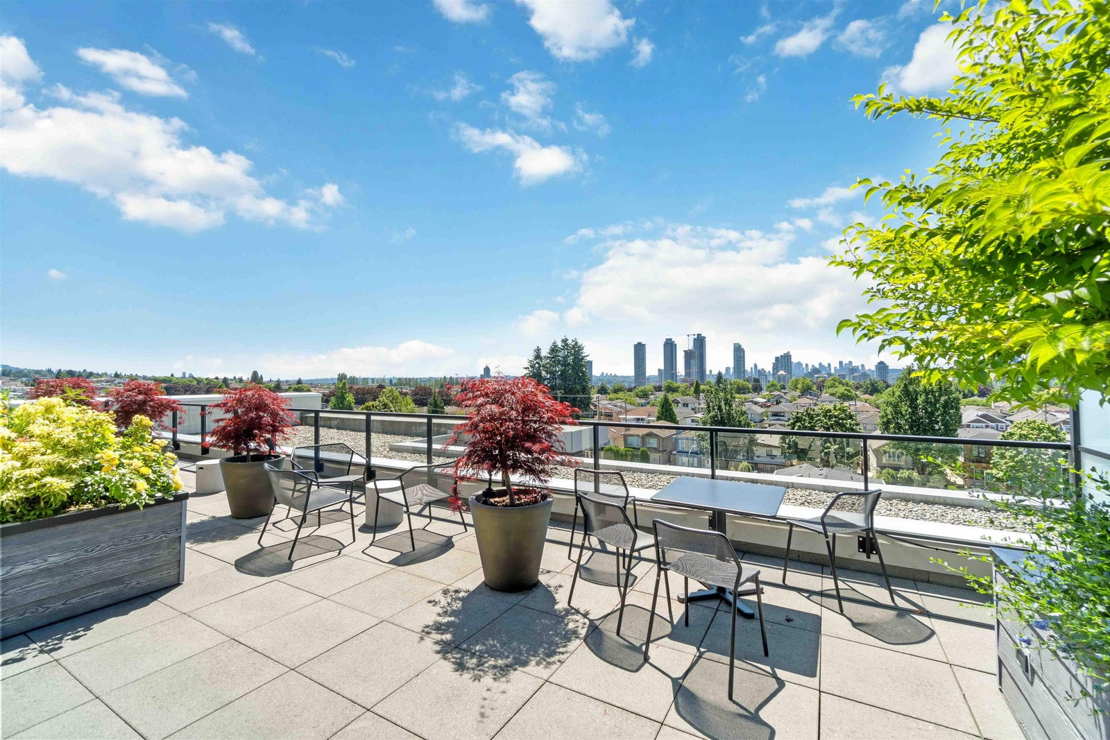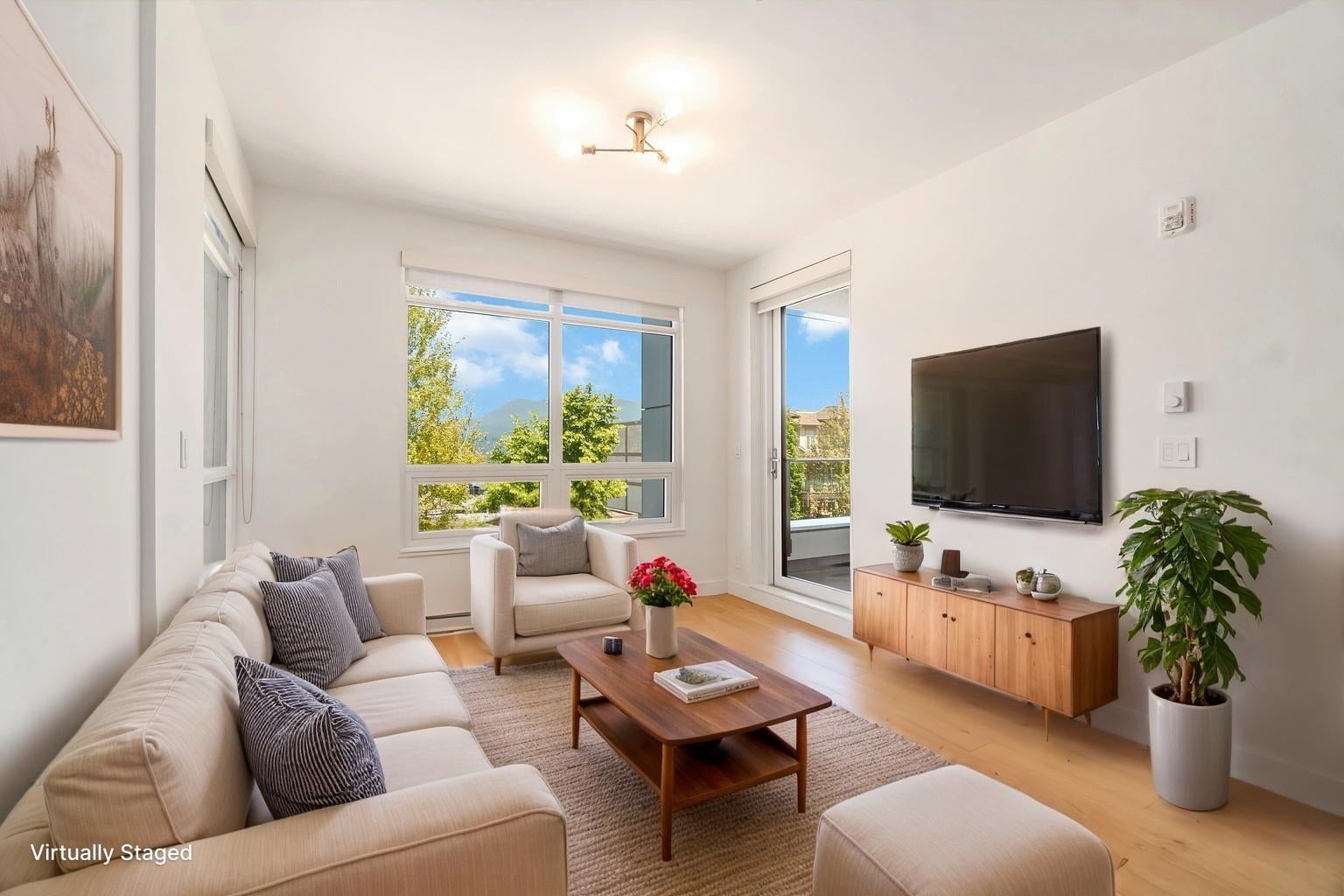 Welcome to Storia by Beedie Living, ideally located in the heart of Burnaby’s vibrant Heights District. This 1198 sq ft 2 bed + den, 3 bath home offers a functional, open concept layout with 9' ceilings, AIR CONDITIONING, roller shades, shaker style cabinets, quartz counters and laminate flooring throughout. The spacious primary bedroom features a walk-through closet and spa-inspired 5-piece ensuite with in-floor heating. Enjoy a chef-inspired kitchen with integrated appliances, wall oven, and pantry. The den is perfect as a home office or guest room. Large second bedroom with ensuite, on opposite side of living space. Private patio with gorgeous VIEWS of the North Shore Mountains! Rooftop terrace w/outdoor seating and panoramic views. Steps to transit, groceries, shopping, and schools.