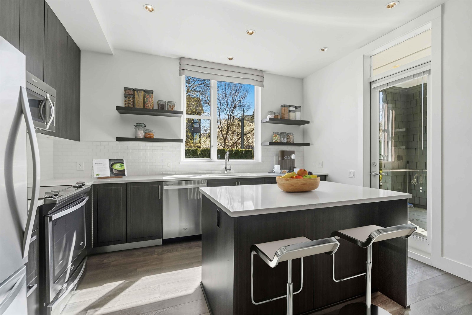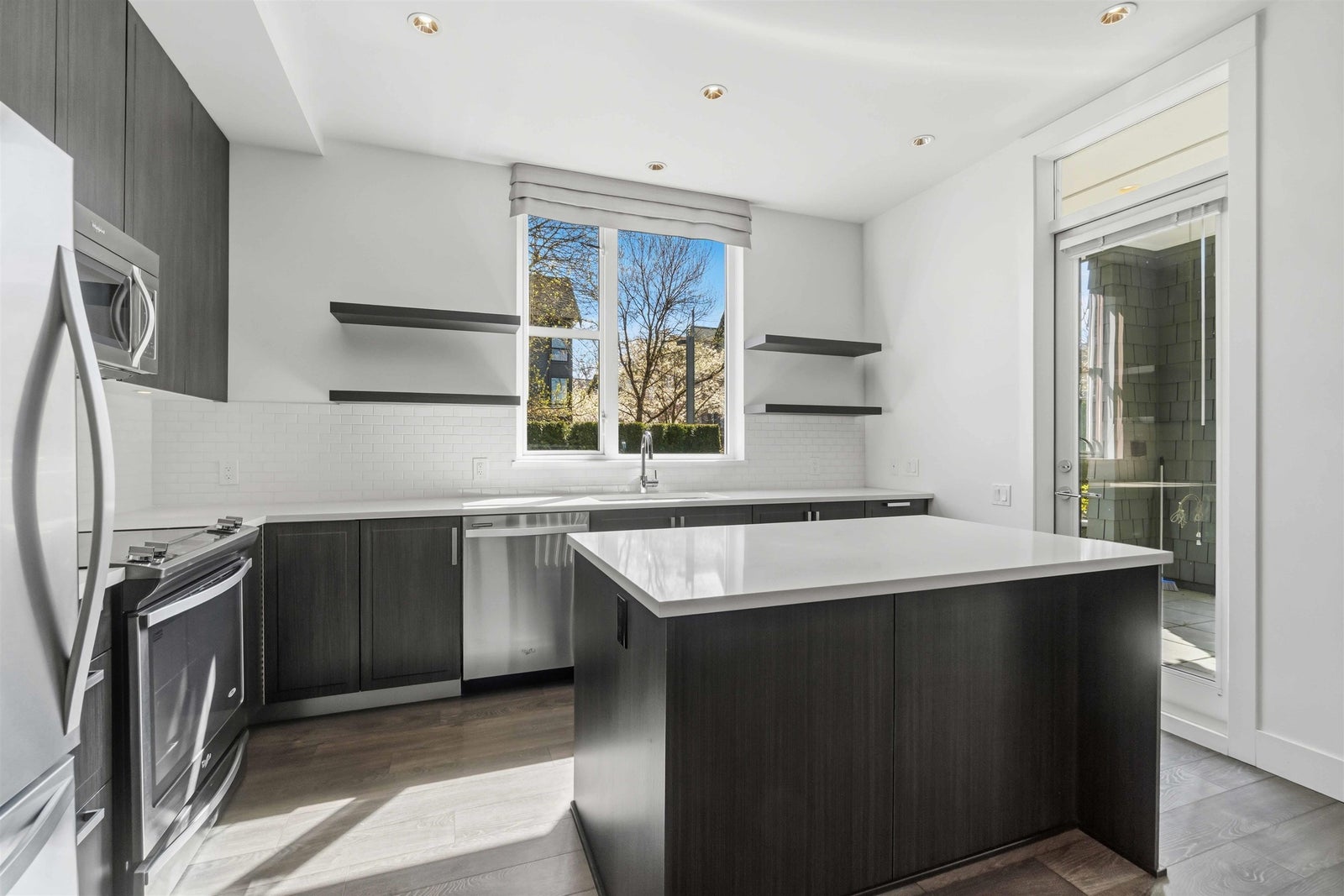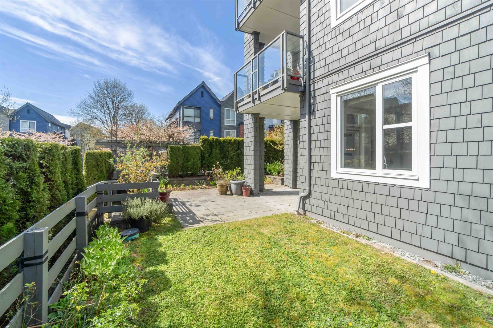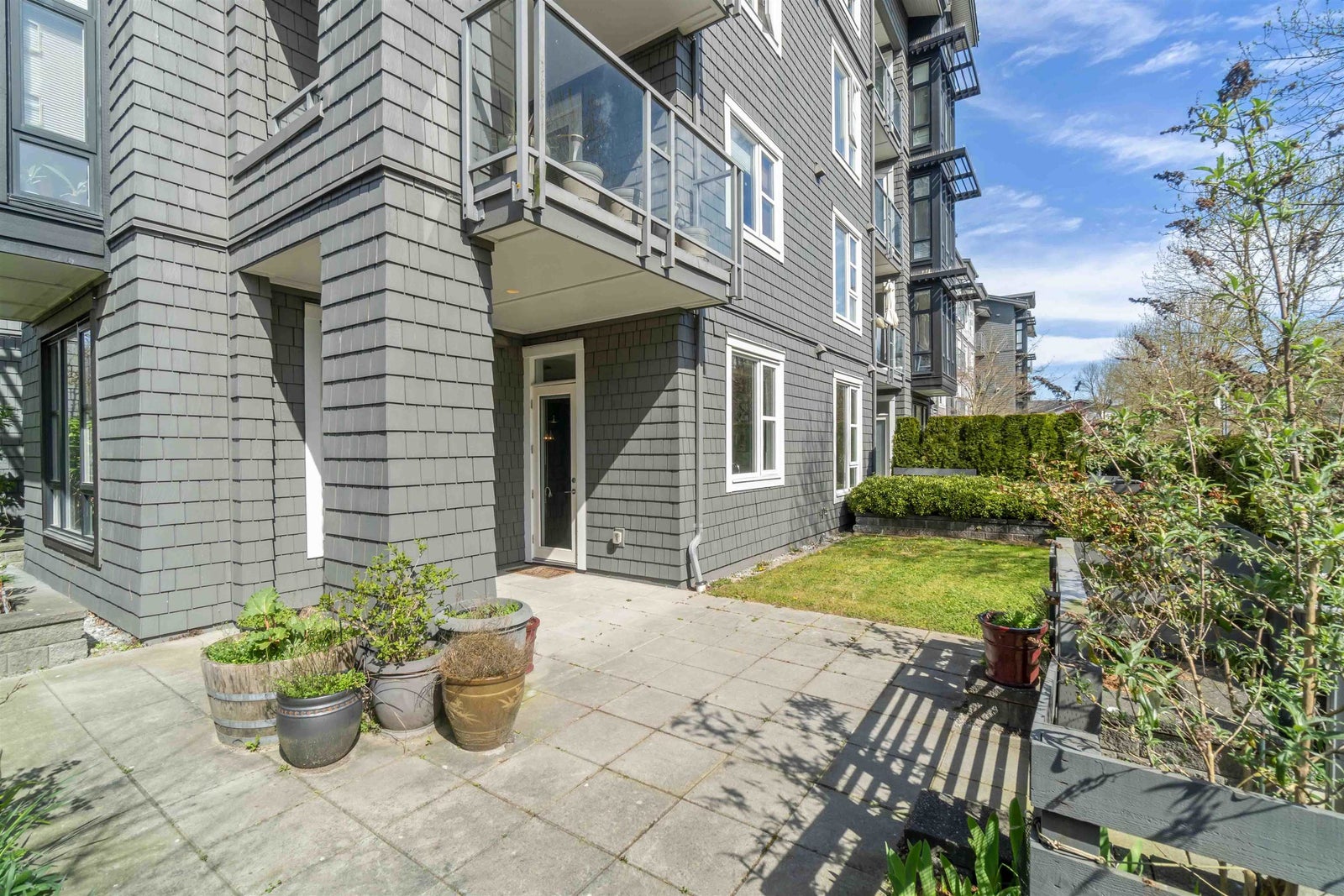 Rare opportunity to own one of the best homes in highly sought-after Fremont Green by Mosaic Homes. This former show home offers 2 bed, 2 bath, and 1,081 sq ft in a bright ground floor corner location. Oversized windows fill the home with natural light, while the open-concept layout offers modern comfort and function. Enjoy a large private patio and fenced yard, plus direct exterior access through the patio for convenient townhouse-style entry. Features include quartz counters, stainless steel appliances, radiant in-floor heating, and a spacious primary with dual sinks in the ensuite. Includes 2 parking and 1 storage. Access the 12,500 sq ft River Club with pool, gym, basketball court, and lounge. Steps to Fremont Village, trails, Pitt River, shops, dining, and commuter routes.